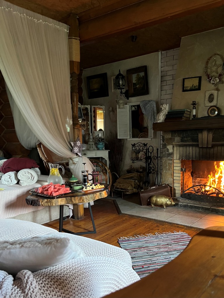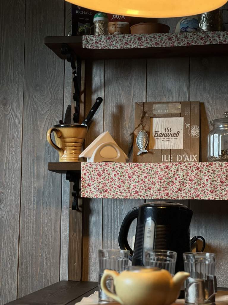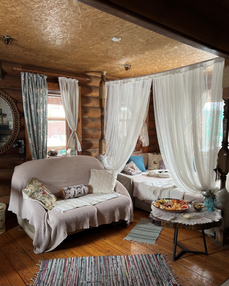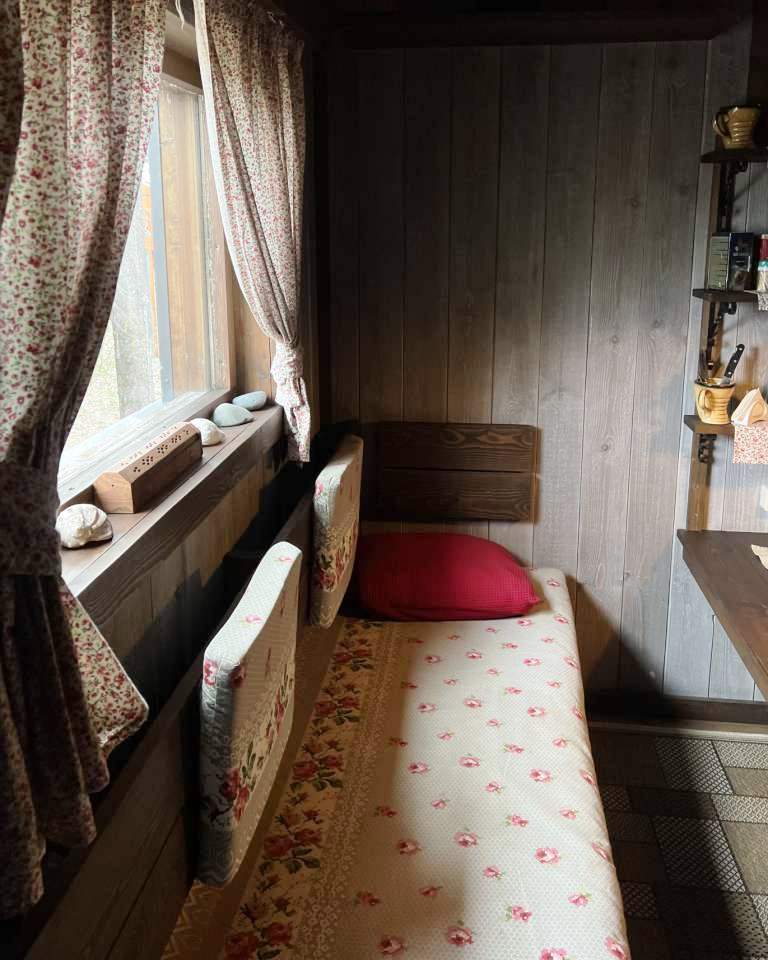 Дом с камином и русской баней, площадью 60 кв.м., состоит из комнаты отдыха с двумя диванами (2 основных и 2 дополнительных спальных места), столом, камином и бани на дровах. В доме есть телевизор, чайник, холодильник, микроволновка, предоставляется постельное белье, полотенца, посуда. Работает Wi-Fi. Биотуалет. Дрова, решетки предоставляются, можно приготовить шашлык прямо в камине или в зоне барбекю на улице. С собой нужно взять питьевую воду и уголь.