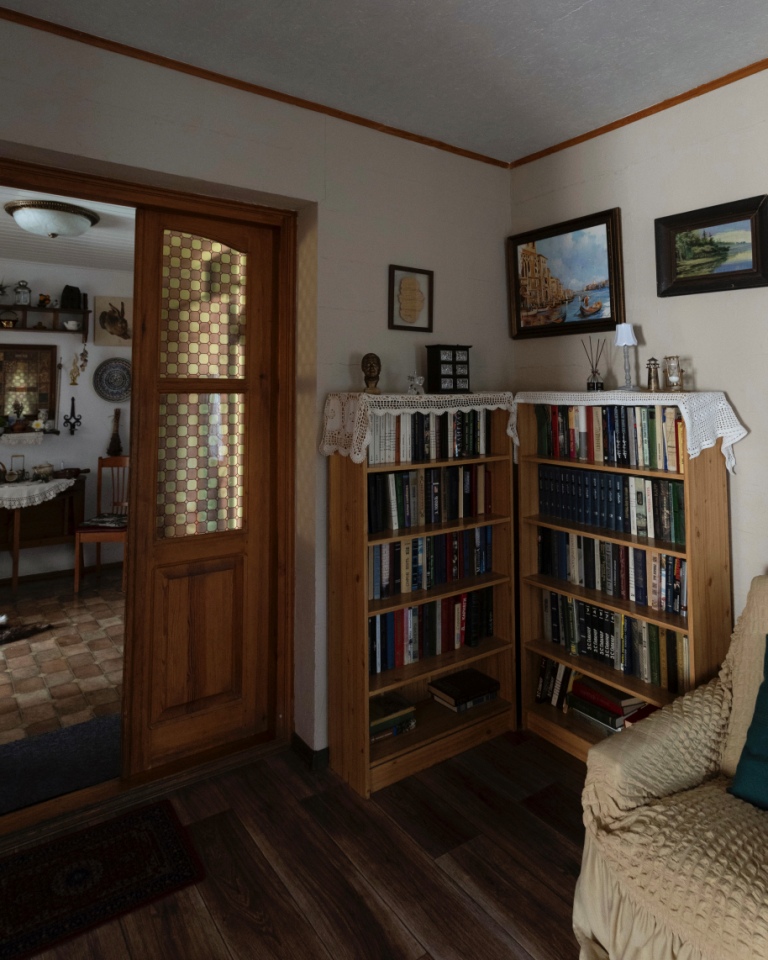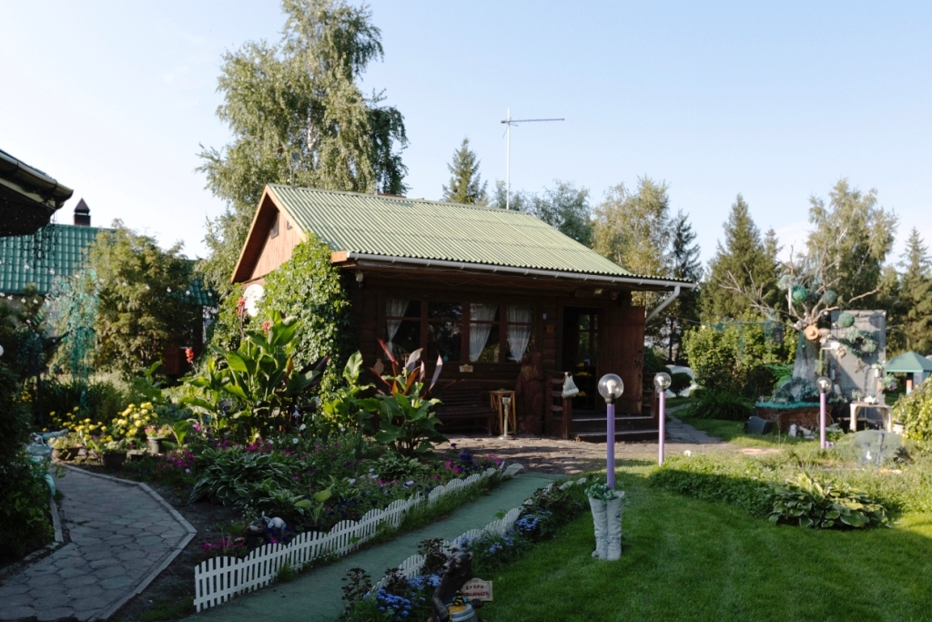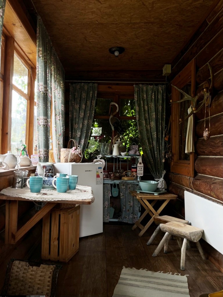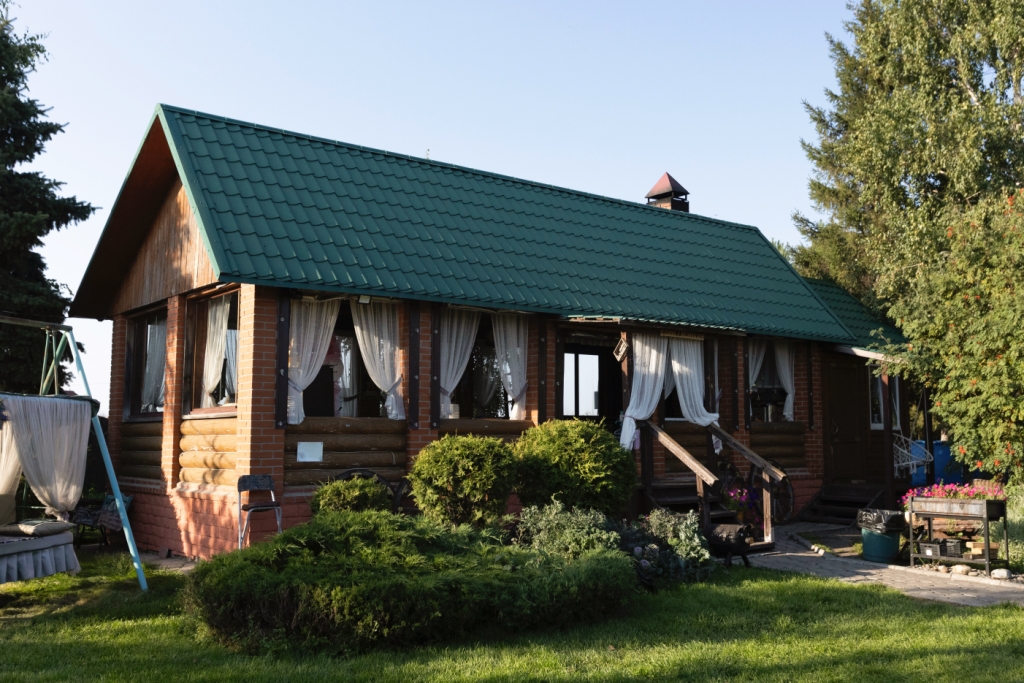 В доме с панорамной гостиной находятся три комнаты, кухня, туалет с душевой кабиной и гостиная с панорамным видом. Русский стиль выдержан до мелочей и придает усадьбе неповторимое очарование и уют. Кухня оборудована всем необходимым. Есть газовая плита, холодильник, микроволновая печь, чайник. Посуды будет достаточно для любой компании. В доме есть два телевизора и музыкальный центр без караоке. В доме 10 основных спальных мест. В одной спальне расположена двуспальная кровать, в другой спальне две двуспальные кровати, в третьей спальне раскладной диван и в гостиной раскладной диван. В качестве дополнительных спальных мест предоставляются раскладушки. В панорамной гостиной за большим столом на банкет могут разместиться до 35 человек. Работает Wi-Fi.