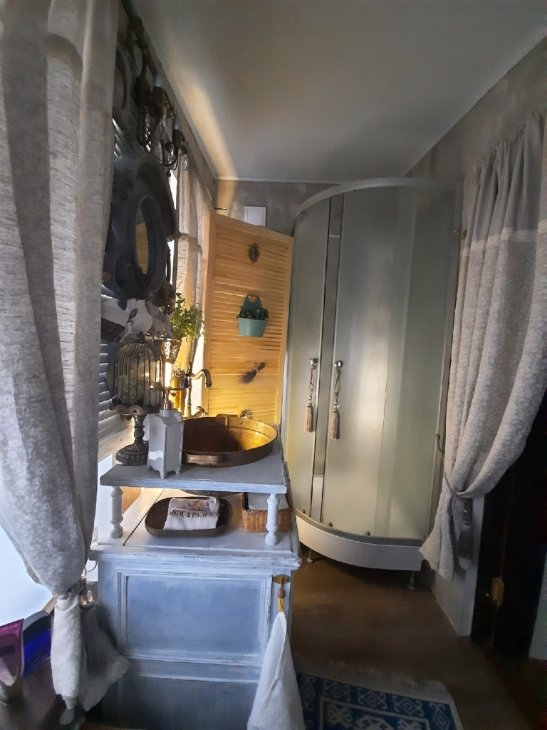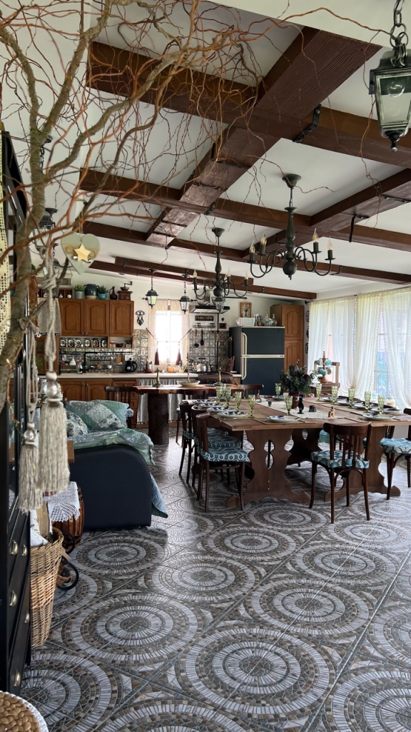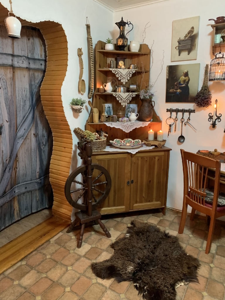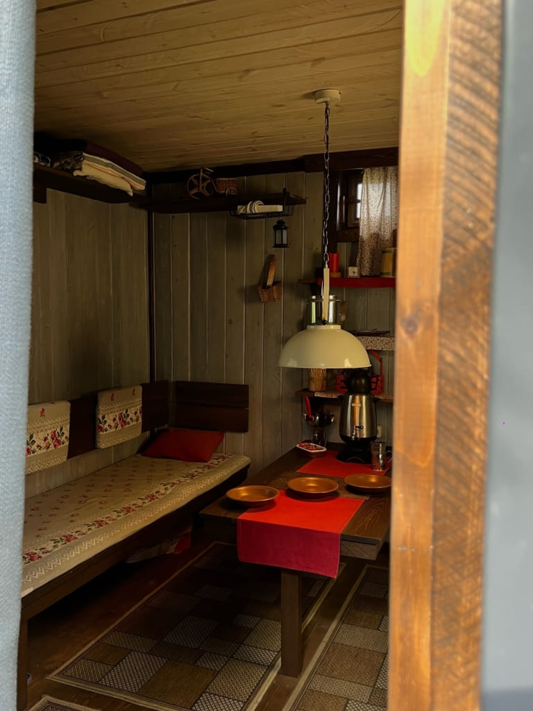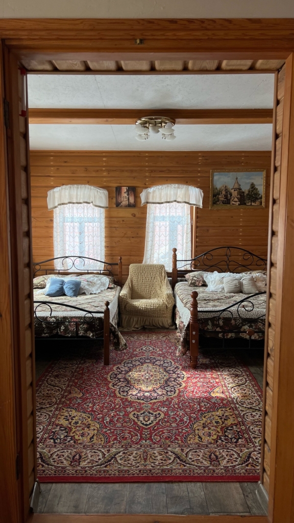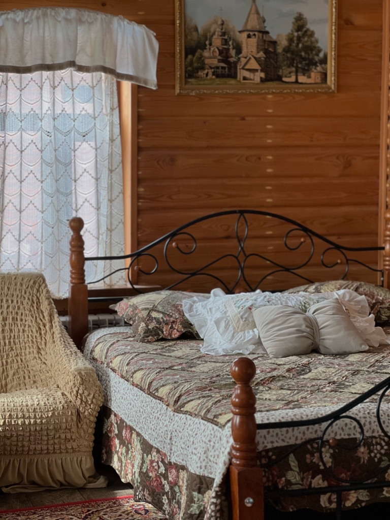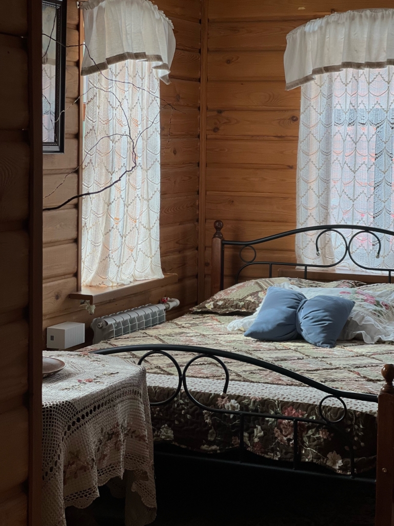 В доме с панорамной гостиной находятся две комнаты, кухня, туалет с душевой кабиной и гостиная с панорамным видом. Русский стиль выдержан до мелочей и придает усадьбе неповторимое очарование и уют. Кухня оборудована всем необходимым. Есть газовая плита, холодильник, микроволновая печь, чайник. Посуды будет достаточно для любой компании. В доме есть два телевизора и музыкальный центр без караоке. В доме 10 основных спальных мест - 3 двуспальных кровати и 2 раскладных дивана. В качестве дополнительных спальных мест предоставляются раскладушки. В панорамной гостиной за большим столом на банкет могут разместиться до 40 человек. Работает Wi-Fi.