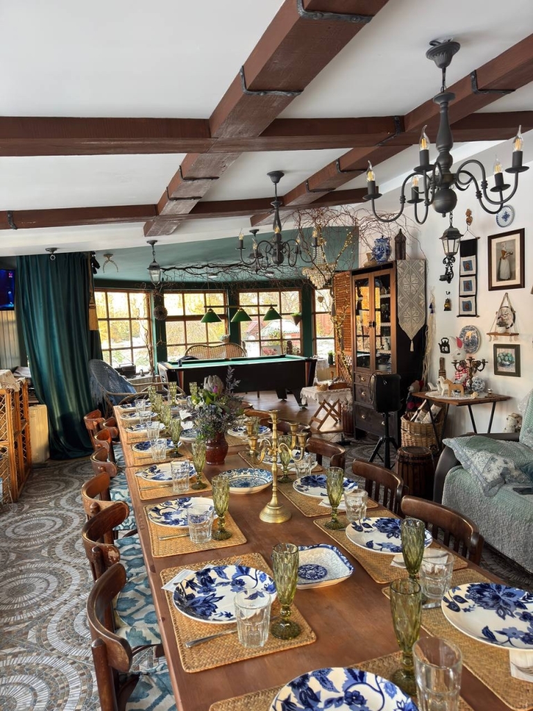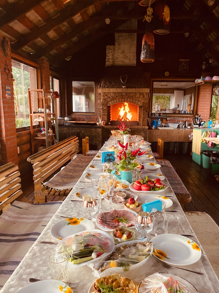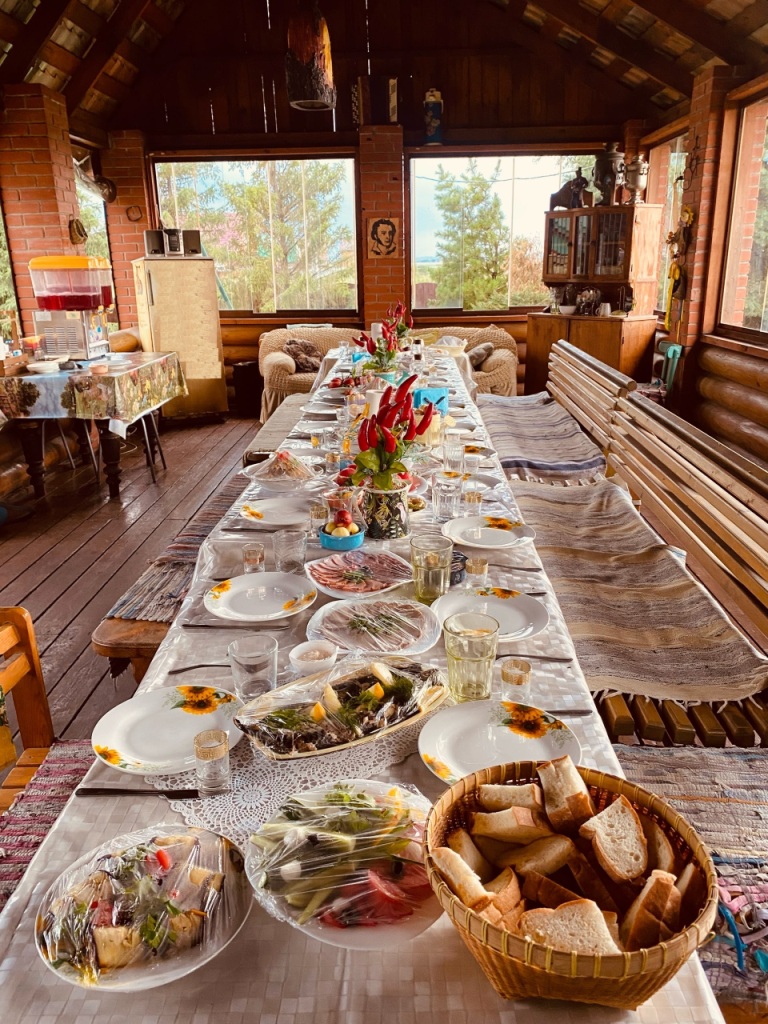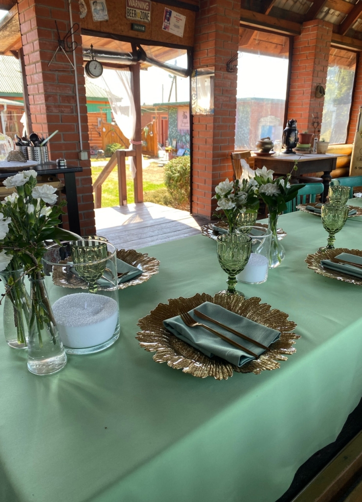 На просторной застекленной веранде могут разместиться до 45 чел. Мангальная зона с казаном, тандыром, пароконвектоматом. Шампура, решетки, дрова предоставляются. С собой нужно взять питьевую воду и уголь. Предоставляются услуги повара.
