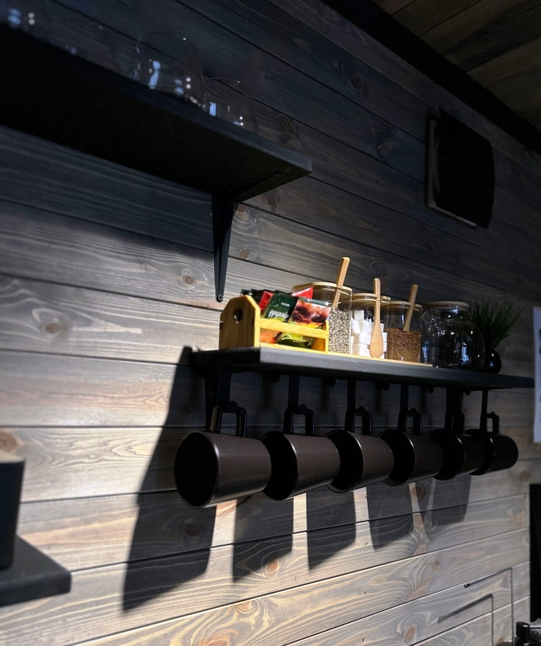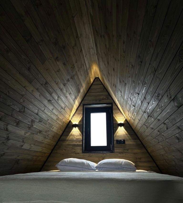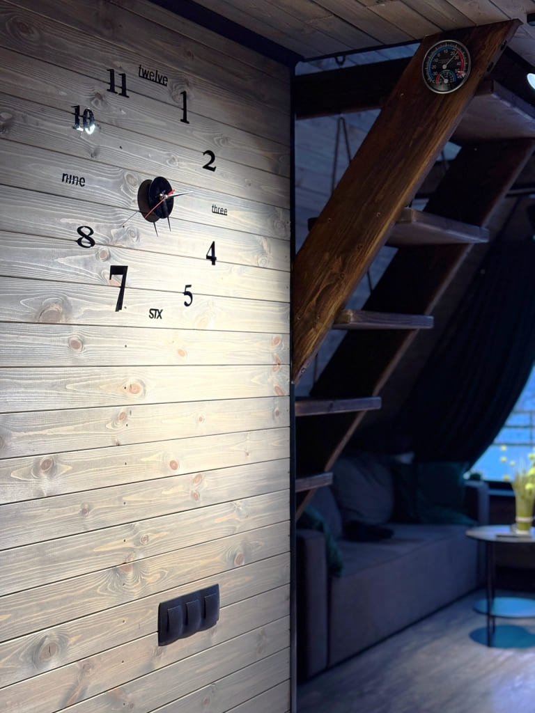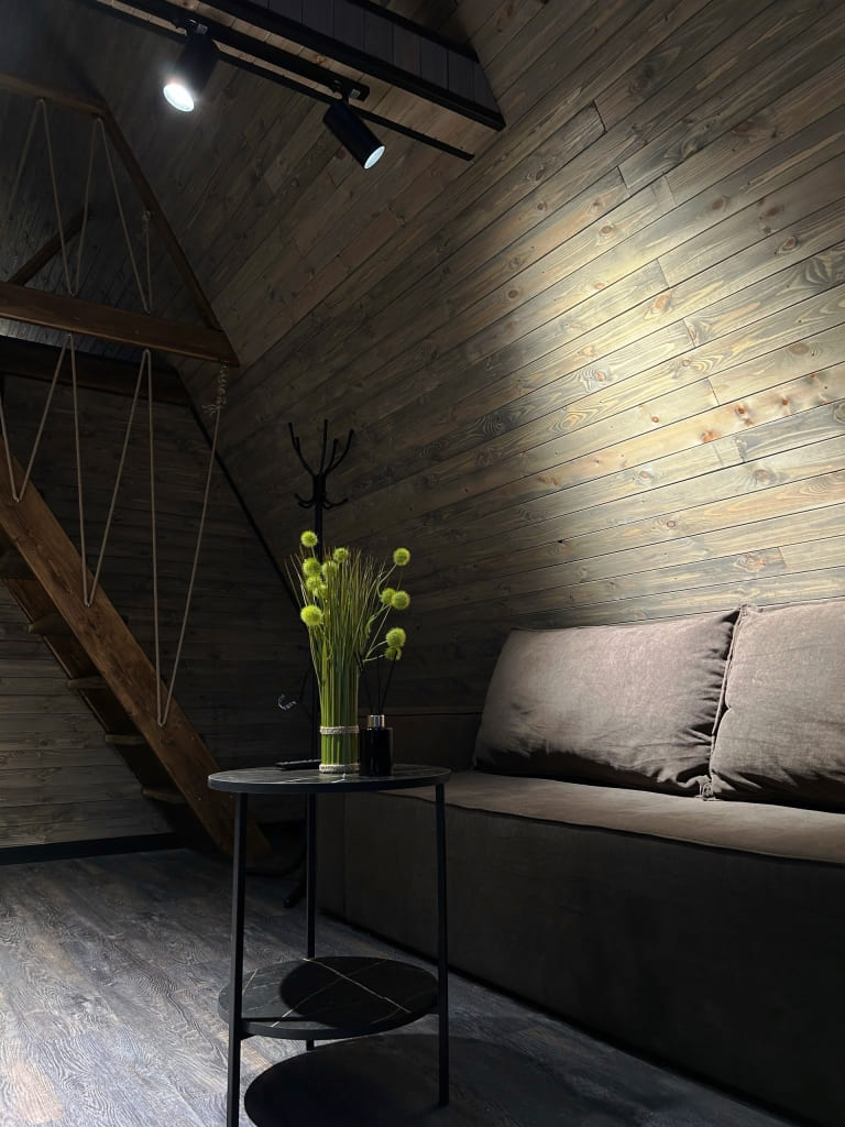 В уютном доме площадью 45 кв. расположены кухня-гостиная, санузел с душевой кабиной, раскладной диван на 2 спальных места. По лестнице можно подняться на 2 этаж, где комфортно могут расположиться на двуспальной кровати 2 чел. Всего в доме 4 спальных места, постельное белье предоставляется. Максимальная вместительность 6 чел. В кухне-гостиной есть кухонный уголок с электроплитой, холодильником, набором посуды на 6 чел., стол со стульями, телевизор. Для комфорта в зимний период установлена система теплый пол, летом можно воспользоваться кондиционером. Также есть музыкальная колонка. Работает Wi-Fi.