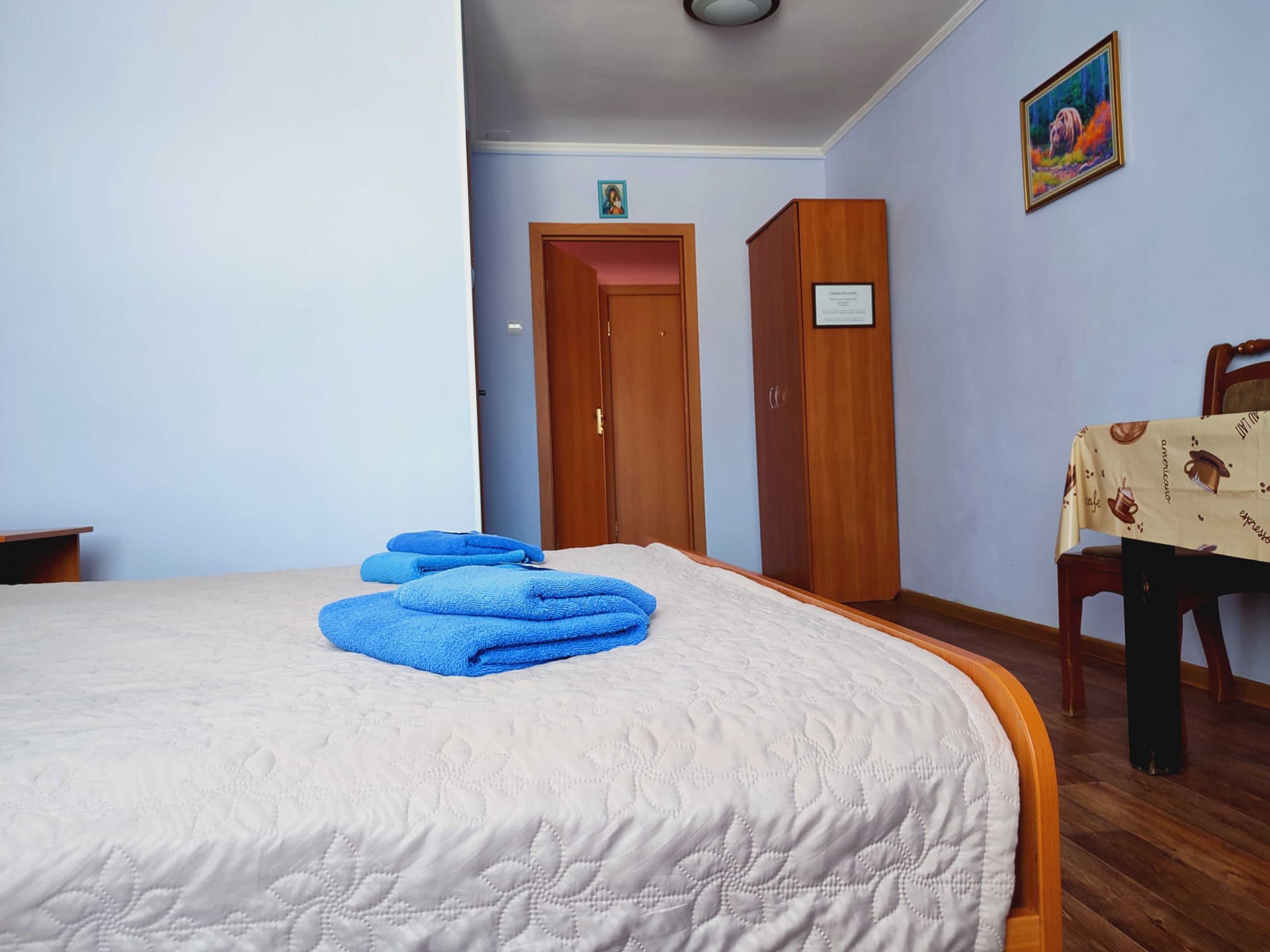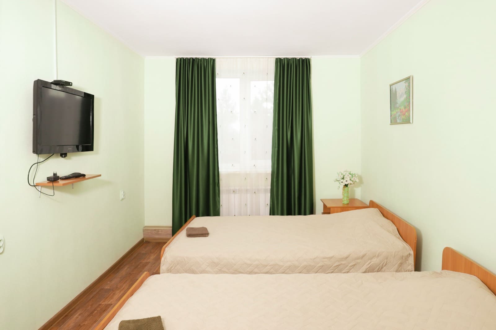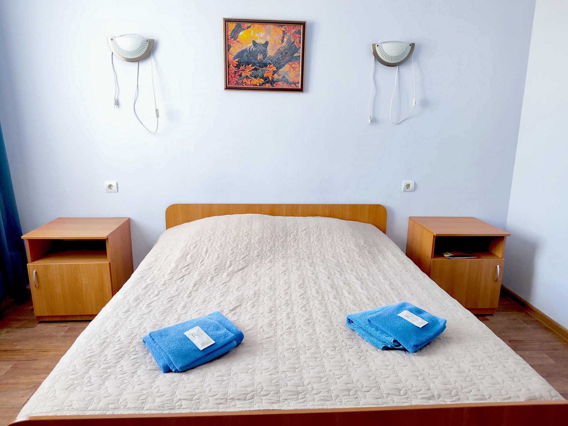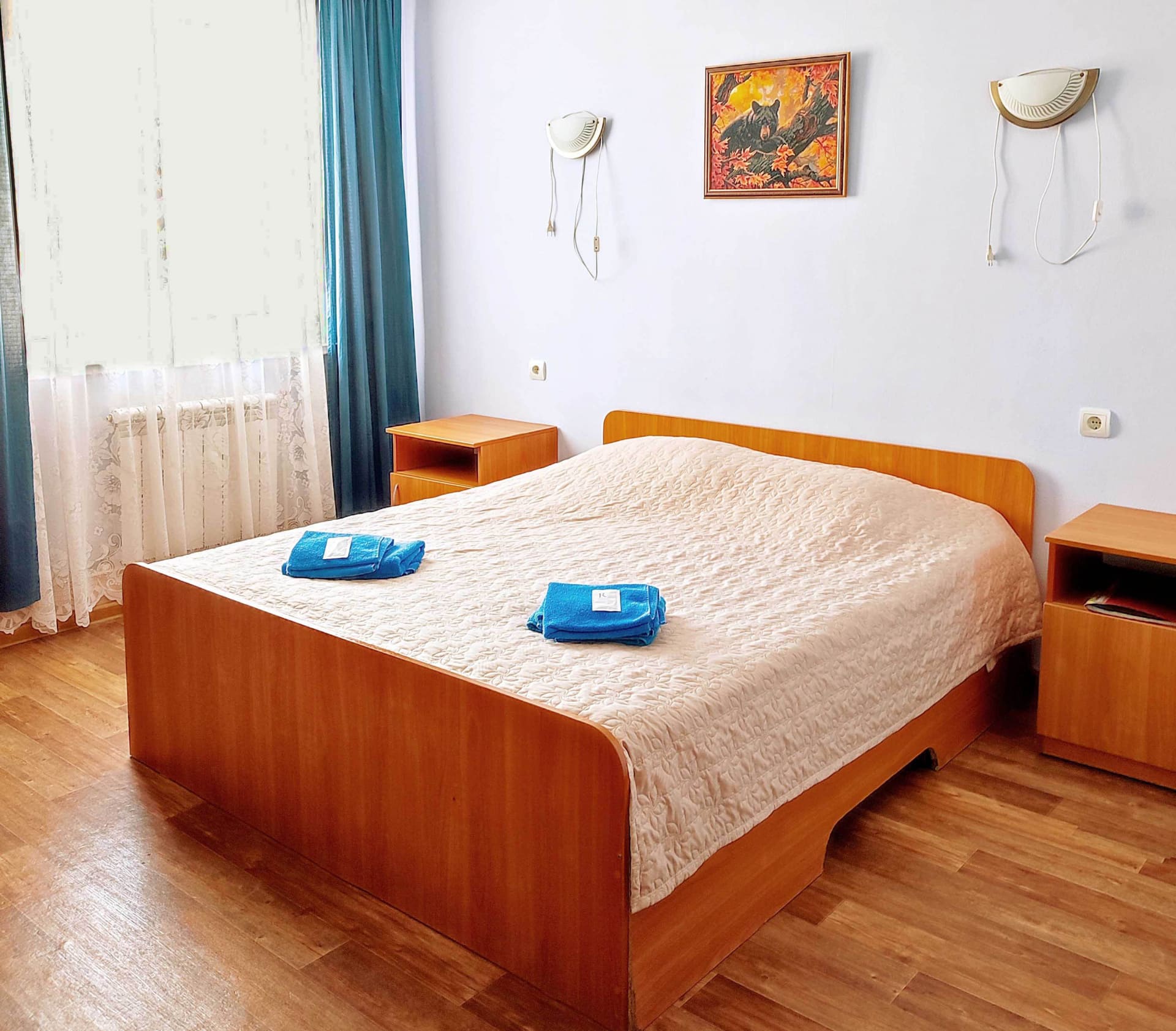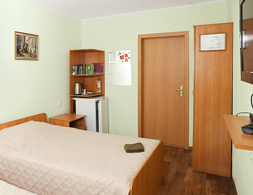 Эконом (две полутороспальные или двуспальная кровати, телевизор, холодильник, чайник, удобства на этаже). Максимальная вместительность 2 человека. Стоимость аренды в будни на 2 чел. 1800 руб./сут, выходные - 2300 руб./сут.